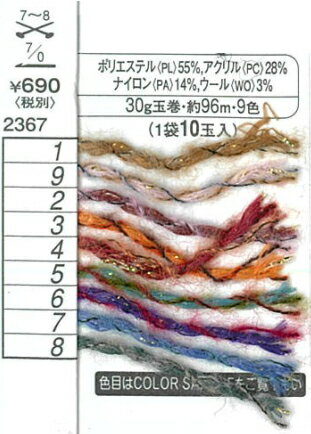 構成:ポリエステル55% アクリル28% ナイロン14% ウール3% 仕立:30g玉巻(約96m) 棒針:7〜8号(標準ゲージ:19目29段) かぎ針:7/0号(長編み:17目8.5段) ※ 実際の色目と多少異なる場合があります。