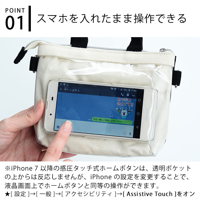 スマートフォンは、バッグの中から入れるようになっているので、バッグが傾いて落ちる心配もありません。
